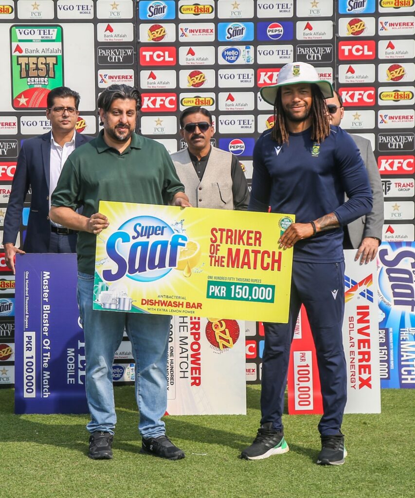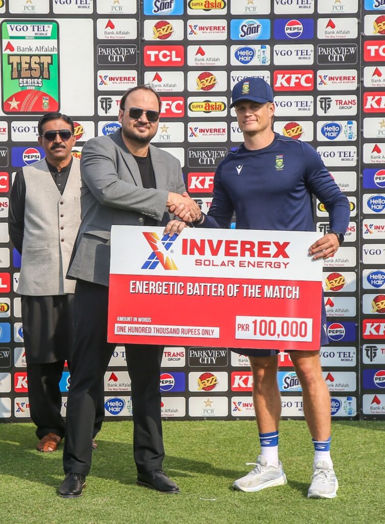 ان کو اسی سکور پر نعمان علی نے کلین بولڈ کر دیا۔یہ نعمان علی کی میچ میں دسویں وکٹ تھی۔ویریان ریکلٹون کا ساتھ دینے آئے لیکن کھانے کے وقفے سے چند لمحے قبل مضبوط دیوارریکلٹون کو ساجد خان نے سلمان آغا کے ہاتھوں 45رنز پر گرادیااور میچ پاکستا ن کے حق میں چلا گیا۔انکی اننگز 145گیندوں پر مشتمل تھی اور ریکلٹون نے چار چوکے لگایے۔کھانے کے وقفے تک سکور چھ وکٹ پر 137 رنز بنایے۔تھے۔کھانے کے وقفے کے بعد پہلے ساجد خان نے موتھو سوامی کو چھ رنز کے انفرادی سکور پر لیگ بی فور کیا۔اس کے بعد شاہین آفریدی نے ویریان کو 19رز پر ایل بی ڈبلیو کیا اور اگلے ہی اوور میں انہوں نے سبریان کو آٹھ کے انفرادی سکور پر بولڈ کردیا۔ایک گیند بعد شاہین آفریدی نے ربادا کو بھی بولڈ کرکے پاکستان کو 93 رنز کی فتح دلادی۔جنوبی افریقہ کی ٹیم 183آوٹ ہوگیی۔
